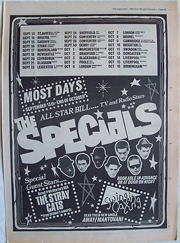 11 September 1980 until 16 October 1980. The Stray Cats are on this poster as one of the two support acts. However they pulled back from this tour before it started. All posters and T-shirts were printed already and are sometimes for sale on marketplaces like Ebay, etc. Nice if you are a Specials fan, but the Stray Cats never appeared on any of these shows. This info is from Pete Shells who was in charge of merchandising for this tour. |