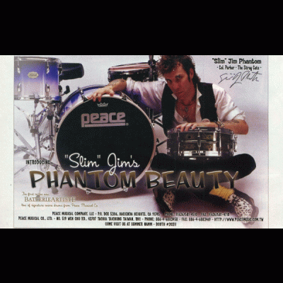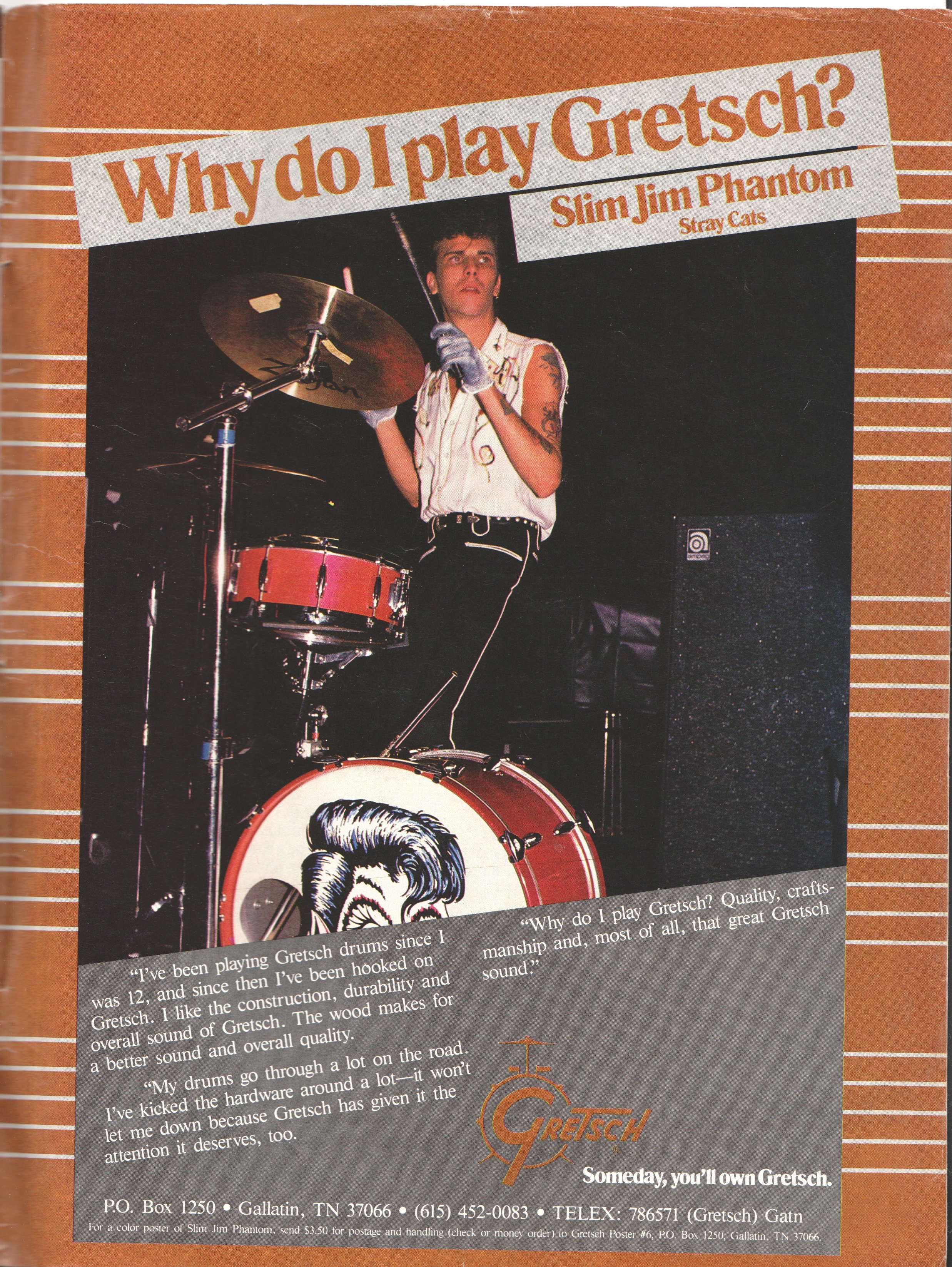 In 1984 Slim Jim signed a deal with Gretsch drums to promote Gretsch drums. He appeared in print ads. This advertisement is from the January 1984 issue of Modern Drummer. In that issue there is also a big interview with him where he also talks about the deal with Gretsch. Please see Magazines for that. Click the pic to make it big. |