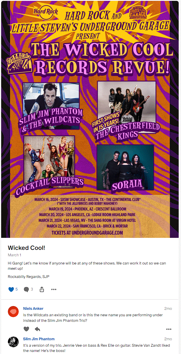 2024 | Slim Jim Phantom first used this name for the 2024 Wicked Cool Records Revue. When asked about this on Patron he stated that it was a version of the trio. See his answer here. |