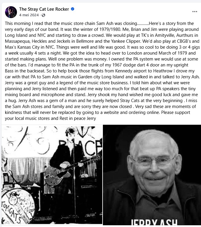 | Jerry Ash | Owner of the Sam Ash music stores. He paid way too much for the gear of Lee Rocker when Lee came in to raise fund for the trip to England and therefor enabling them to go. On 4 May 2024 Lee wrote this on his Facebook account after the news of the Sam Ash music stores closing down. |